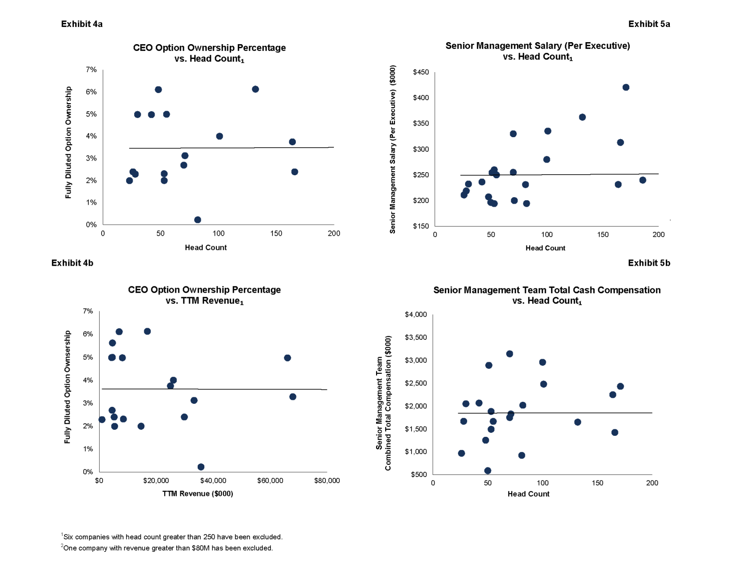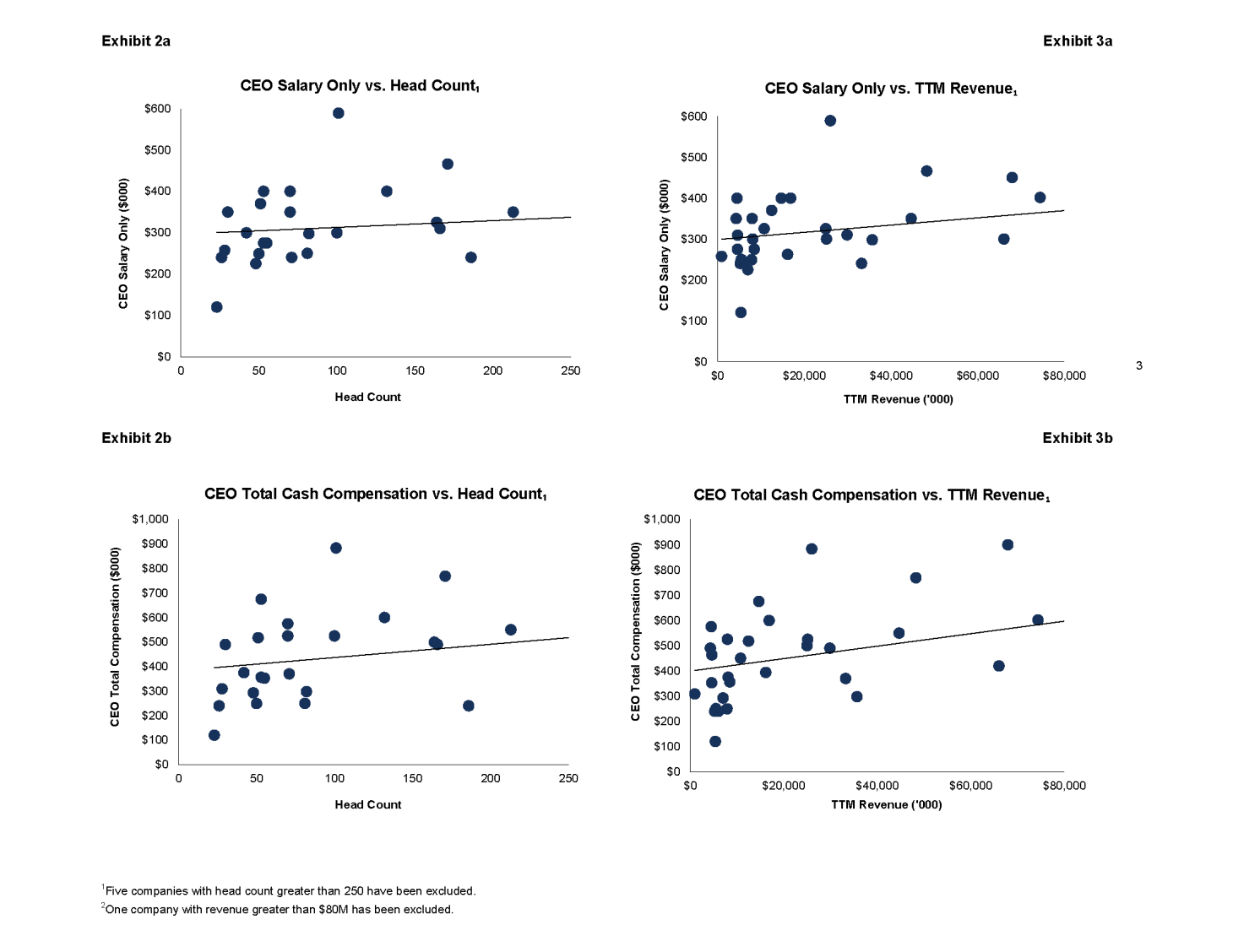 Attached are the results of the 2021 RC Capital Senior Management Compensation Survey. Thirty-one private-growth companies from the healthcare and IT sectors participated in this year’s survey. Companies provided data on compensation components – cash and stock – for senior management and independent directors, as well as data with respect to D&O insurance and audit expenses. Data was collected from RCC and TripleTree portfolio companies for 2021 compensation and company head count and TTM revenue are noted as close to December 2020 as possible. The survey data is illustrated in the exhibits attached.