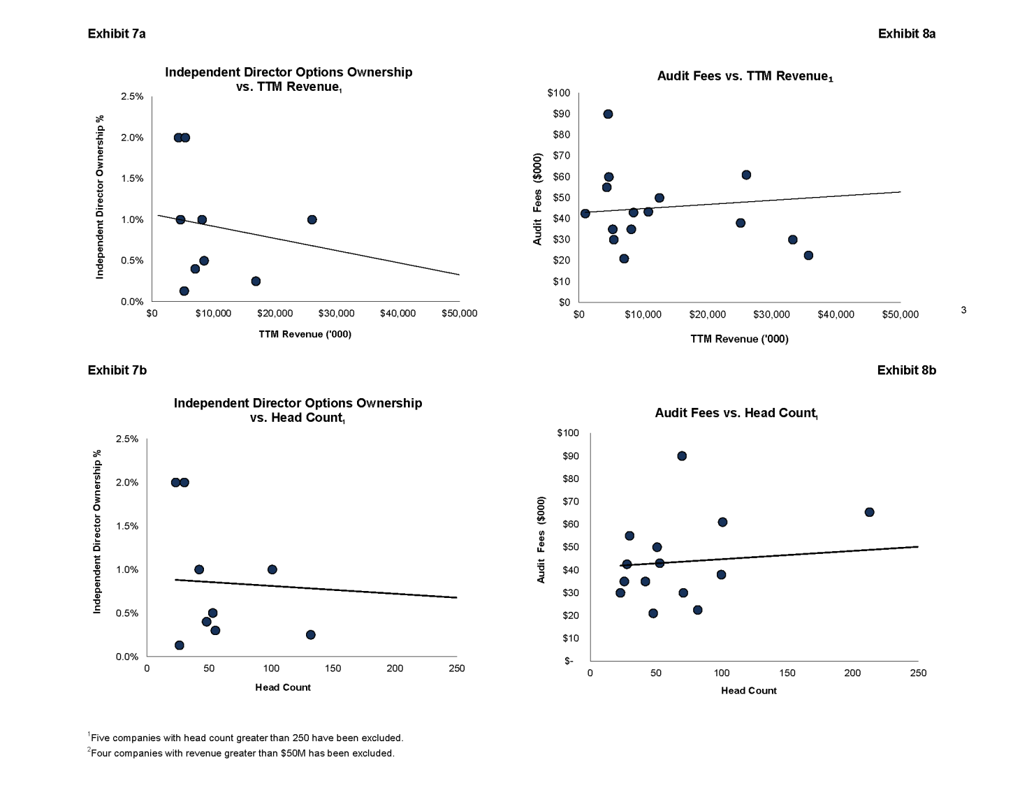 According to the analysis, larger companies tend to offer a slightly smaller percentage of option ownership given the higher value of the options. Out of 14 companies with independent directors, six compensate with options only, three companies compensate with cash only and five compensate with both cash and options. The average option and cash compensation were 0.79% (options on a fully diluted basis) and $27k per director per year, respectively.