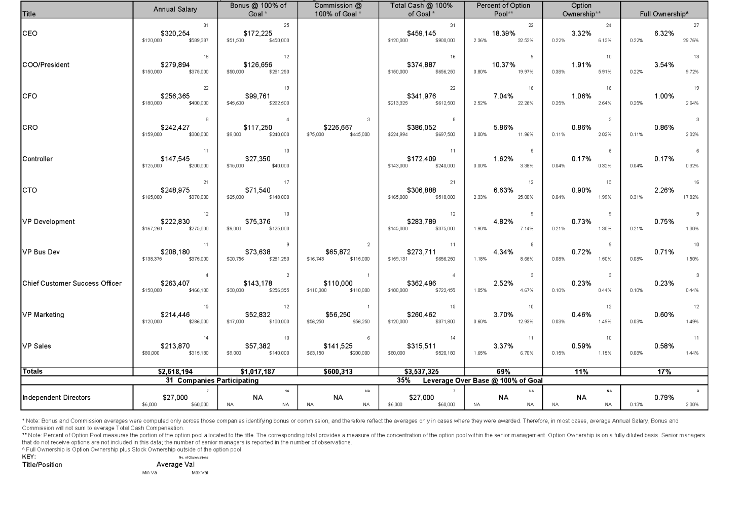 Similar to the CEO compensation data, this analysis suggests that the total compensation of senior management teams have little correlation with head count and only a slightly higher correlation with revenue. On average, target bonuses and commissions provided 35% more compensation leverage over base salaries. CROs had the most variable compensation over base with 59%, respectively, followed closely by VP Sales (48%), CEO (43%), and Chief Customer Success Officer (38%).